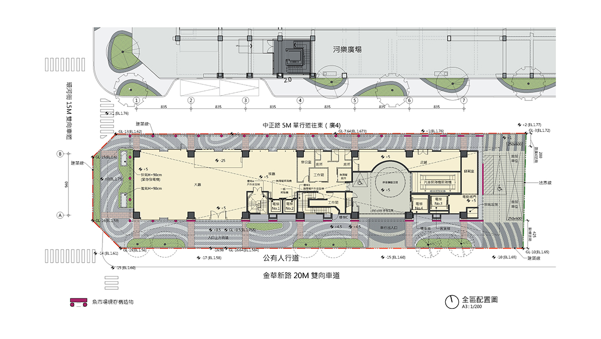 本案作為觀光地帶的蛋黃區,不僅有動線上的受益,還有歷史景觀的潛力。魚市場現存構造物是在地人的記憶景觀,能直接與河樂廣場產生視覺與空間上的連結。